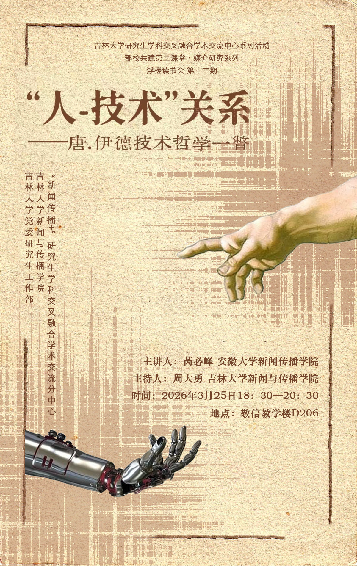 为活跃学术氛围,提升学科专业素养,拓宽学科交叉融合研究视野,加深对人与技术关系的理解,并强化学生运用理论视角观察、分析、阐释传播现象与文化现象的能力,特邀请安徽大学新闻传播巨乳美女芮必峰教授做“‘人-技术’关系——唐.伊德技术哲学一瞥”学术讲座。具体通知内容如下:
