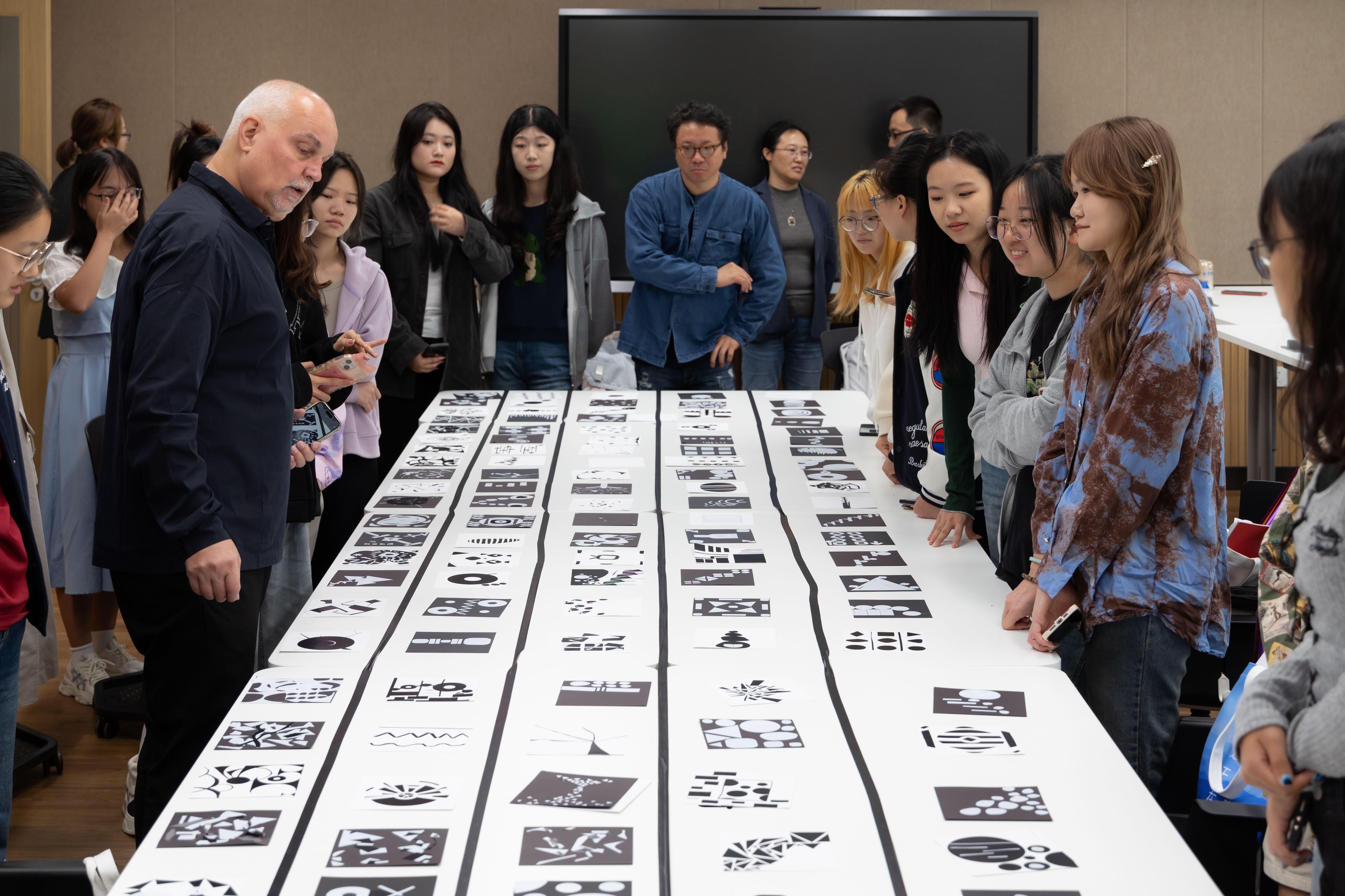 9月21日,吉林大学广告文化研究中心副主任王博学对两位教授的到来表示热烈欢迎,并简单介绍了两位教授的研究领域与创意工作坊的内容安排。Markus Weisbeck教授和Vera Kunz教授围绕工作坊主题,介绍了以往举办工作坊活动的经验,并希望同学们能够放松学习状态,在为期3天的工作坊里做到最好。Markus Weisbeck教授和Vera Kunz教授表示,大家应该在3天的创意活动中收获“意外的发现”。创意工作坊的第一个环节是让同学们发挥想象力,利用黑色与白色的卡片和贴纸表达对5个词语的感受。同学们创作热情积极高涨,完成了一件件出色的作品。